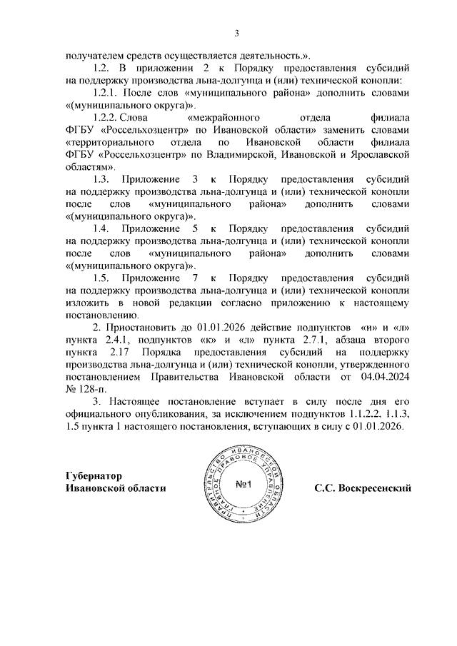 Постановление Правительства Ивановской области от 09.07.2025 N 273-п "О внесении изменений в постановление Правительства Ивановской области от 04.04.2024 N 128-п "Об утверждении Порядка предоставления субсидий на поддержку производства льна-долгунца и (или) технической конопли"