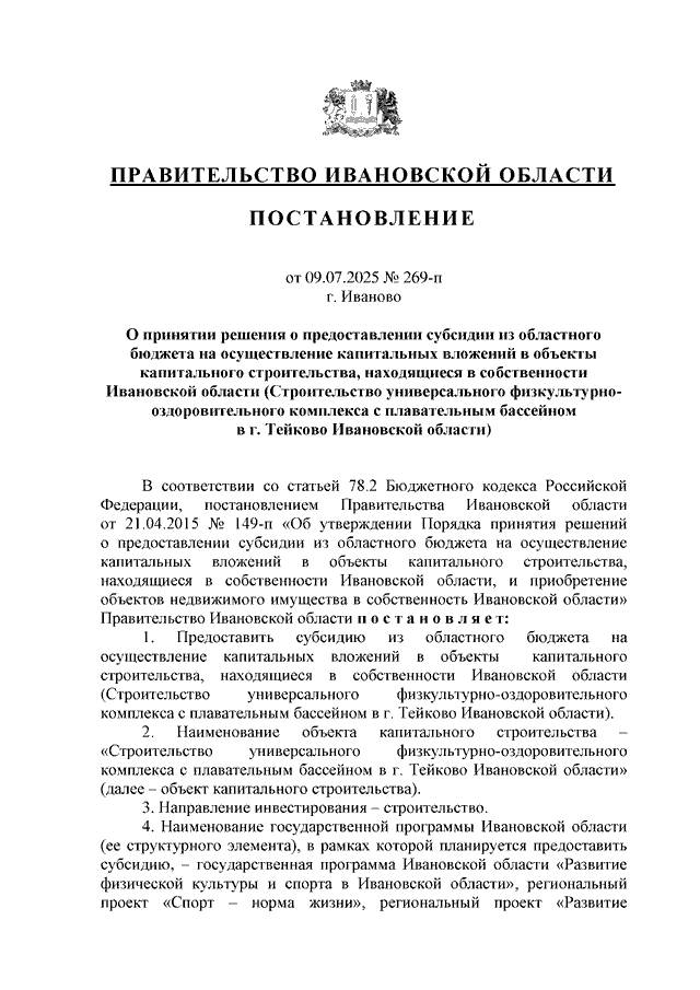 Постановление Правительства Ивановской области от 09.07.2025 N 269-п "О принятии решения о предоставлении субсидии из областного бюджета на осуществление капитальных вложений в объекты капитального строительства, находящиеся в собственности Ивановской области (Строительство универсального физкультурно-оздоровительного комплекса с плавательным бассейном в г. Тейково Ивановской области)"
