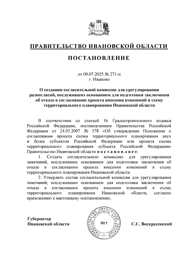 Постановление Правительства Ивановской области от 09.07.2025 N 271-п "О создании согласительной комиссии для урегулирования разногласий, послуживших основанием для подготовки заключения об отказе в согласовании проекта внесения изменений в схему территориального планирования Ивановской области"