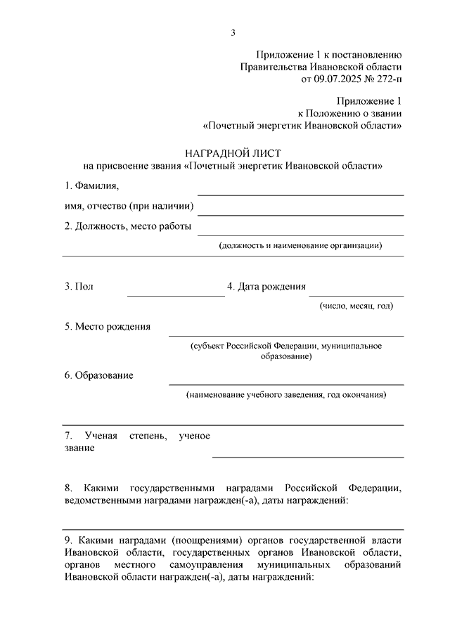 Постановление Правительства Ивановской области от 09.07.2025 N 272-п "О внесении изменений в постановление Правительства Ивановской области от 23.06.2017 N 254-п "Об учреждении звания "Почетный энергетик Ивановской области"