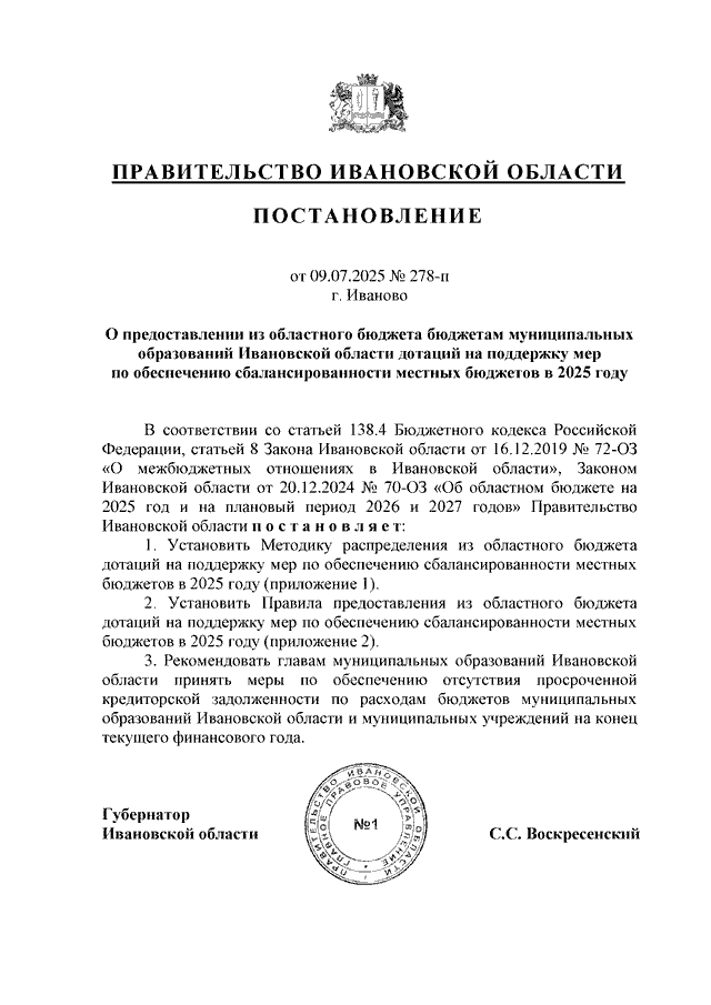 Постановление Правительства Ивановской области от 09.07.2025 N 278-п "О предоставлении из областного бюджета бюджетам муниципальных образований Ивановской области дотаций на поддержку мер по обеспечению сбалансированности местных бюджетов в 2025 году" (вместе с "Методикой распределения из областного бюджета дотаций на поддержку мер по обеспечению сбалансированности местных бюджетов в 2025 году", "Правилами предоставления из областного бюджета дотаций на поддержку мер по обеспечению сбалансированности местных бюджетов в 2025 году")