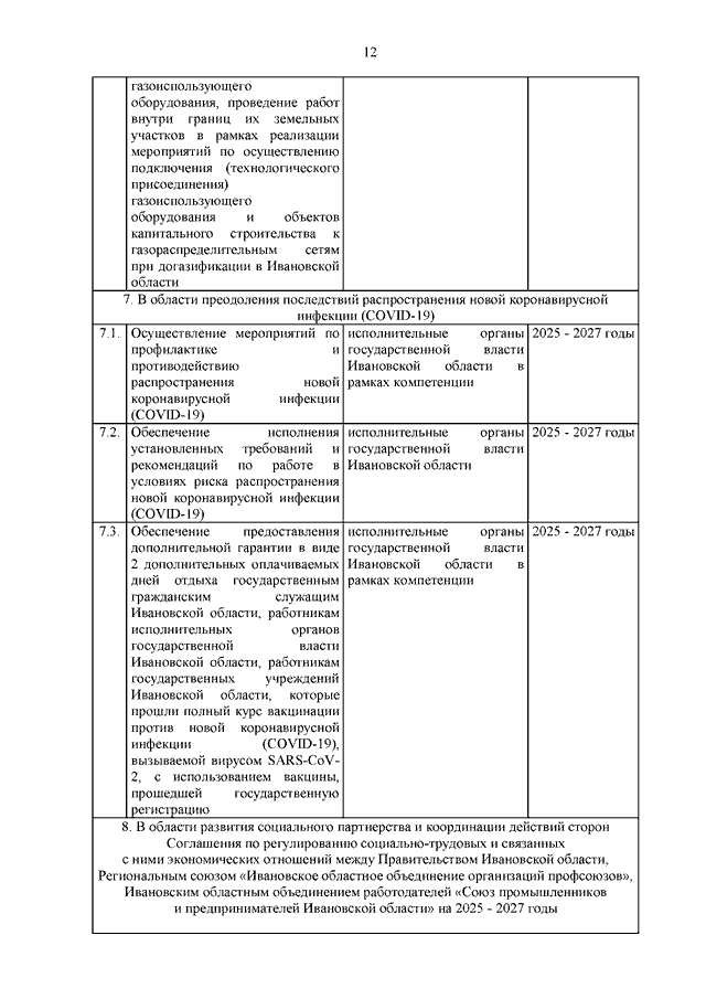 Распоряжение Правительства Ивановской области от 09.07.2025 N 86-рп "Об утверждении плана мероприятий исполнительных органов государственной власти Ивановской области по выполнению Соглашения по регулированию социально-трудовых и связанных с ними экономических отношений между Правительством Ивановской области, Региональным союзом "Ивановское областное объединение организаций профсоюзов", Ивановским областным объединением работодателей "Союз промышленников и предпринимателей Ивановской области" на 2025 - 2027 годы"