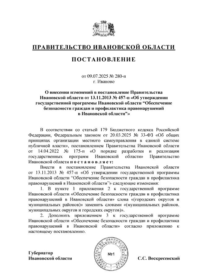 Постановление Правительства Ивановской области от 09.07.2025 N 280-п "О внесении изменений в постановление Правительства Ивановской области от 13.11.2013 N 457-п "Об утверждении государственной программы Ивановской области "Обеспечение безопасности граждан и профилактика правонарушений в Ивановской области" (вместе с "Перечнем объектов капитального строительства, мероприятий (укрупненных инвестиционных проектов), объектов недвижимости, реализуемых в рамках государственной программы (комплексной программы) Ивановской области")