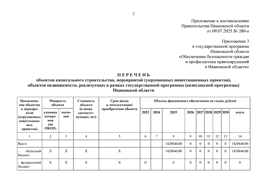 Постановление Правительства Ивановской области от 09.07.2025 N 280-п "О внесении изменений в постановление Правительства Ивановской области от 13.11.2013 N 457-п "Об утверждении государственной программы Ивановской области "Обеспечение безопасности граждан и профилактика правонарушений в Ивановской области" (вместе с "Перечнем объектов капитального строительства, мероприятий (укрупненных инвестиционных проектов), объектов недвижимости, реализуемых в рамках государственной программы (комплексной программы) Ивановской области")