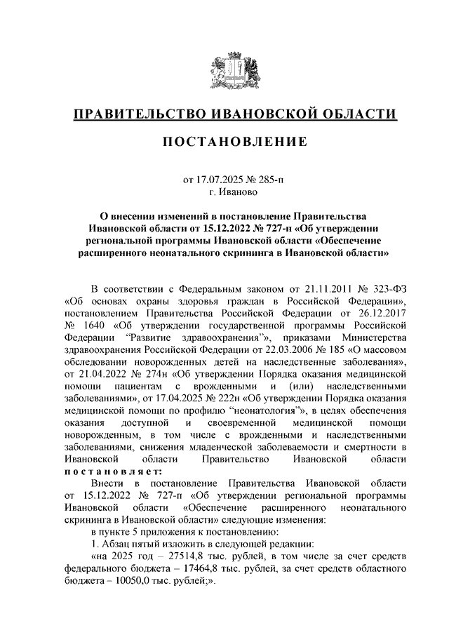 Постановление Правительства Ивановской области от 17.07.2025 N 285-п "О внесении изменений в постановление Правительства Ивановской области от 15.12.2022 N 727-п "Об утверждении региональной программы Ивановской области "Обеспечение расширенного неонатального скрининга в Ивановской области"