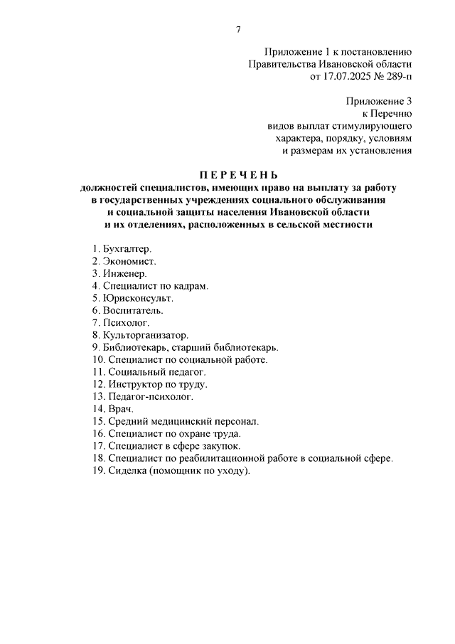 Постановление Правительства Ивановской области от 17.07.2025 N 289-п "О внесении изменений в постановление Правительства Ивановской области от 31.12.2008 N 366-п "О системе оплаты труда работников государственных учреждений системы социальной защиты населения Ивановской области" (вместе с "Перечнем должностей специалистов, имеющих право на выплату за работу в государственных учреждениях социального обслуживания и социальной защиты населения Ивановской области и их отделениях, расположенных в сельской местности", "Перечнем должностей специалистов, имеющих право на выплату за работу в государственных образовательных учреждениях для детей-сирот и детей, оставшихся без попечения родителей, Ивановской области, расположенных в сельской местности")