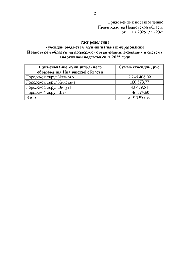 Постановление Правительства Ивановской области от 17.07.2025 N 290-п "О распределении субсидий бюджетам муниципальных образований Ивановской области на поддержку организаций, входящих в систему спортивной подготовки, в 2025 году"