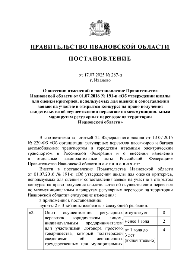Постановление Правительства Ивановской области от 17.07.2025 N 287-п "О внесении изменений в постановление Правительства Ивановской области от 01.07.2016 N 191-п "Об утверждении шкалы для оценки критериев, используемых для оценки и сопоставления заявок на участие в открытом конкурсе на право получения свидетельства об осуществлении перевозок по межмуниципальным маршрутам регулярных перевозок на территории Ивановской области"