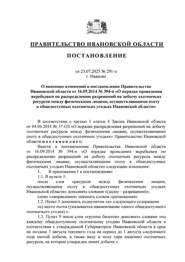 Постановление Правительства Ивановской области от 23.07.2025 N 291-п "О внесении изменений в постановление Правительства Ивановской области от 16.09.2014 N 394-п "О порядке проведения жеребьевки по распределению разрешений на добычу охотничьих ресурсов между физическими лицами, осуществляющими охоту в общедоступных охотничьих угодьях Ивановской области"