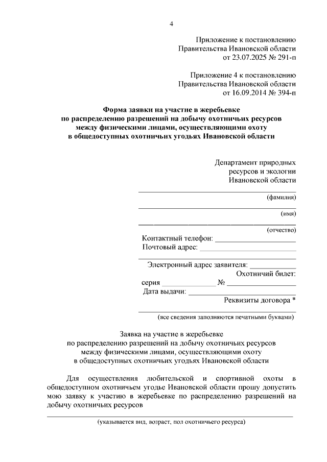 Постановление Правительства Ивановской области от 23.07.2025 N 291-п "О внесении изменений в постановление Правительства Ивановской области от 16.09.2014 N 394-п "О порядке проведения жеребьевки по распределению разрешений на добычу охотничьих ресурсов между физическими лицами, осуществляющими охоту в общедоступных охотничьих угодьях Ивановской области"