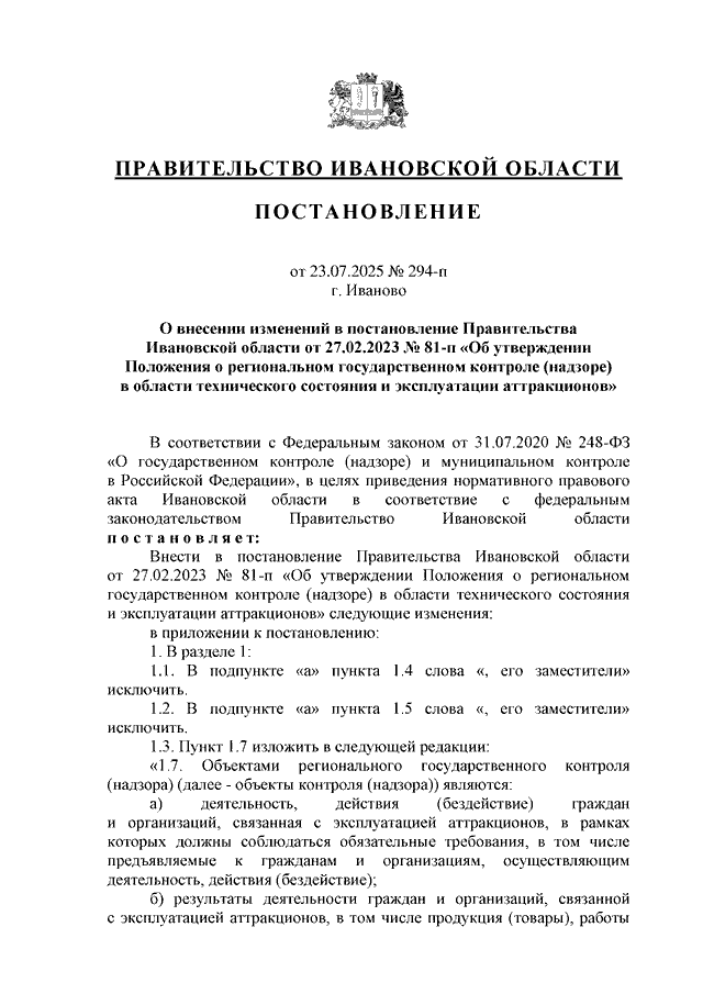 Постановление Правительства Ивановской области от 23.07.2025 N 294-п "О внесении изменений в постановление Правительства Ивановской области от 27.02.2023 N 81-п "Об утверждении Положения о региональном государственном контроле (надзоре) в области технического состояния и эксплуатации аттракционов"