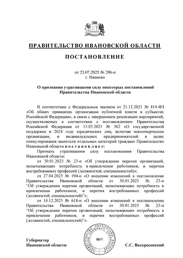 Постановление Правительства Ивановской области от 23.07.2025 N 296-п "О признании утратившими силу некоторых постановлений Правительства Ивановской области"
