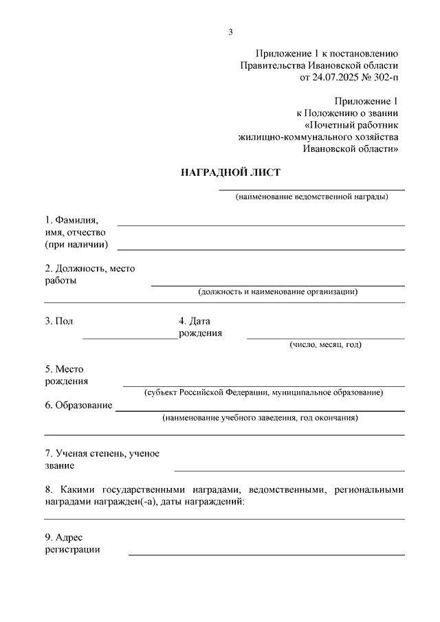 Постановление Правительства Ивановской области от 24.07.2025 N 302-п "О внесении изменений в постановление Правительства Ивановской области от 30.11.2010 N 430-п "Об учреждении звания "Почетный работник жилищно-коммунального хозяйства Ивановской области"