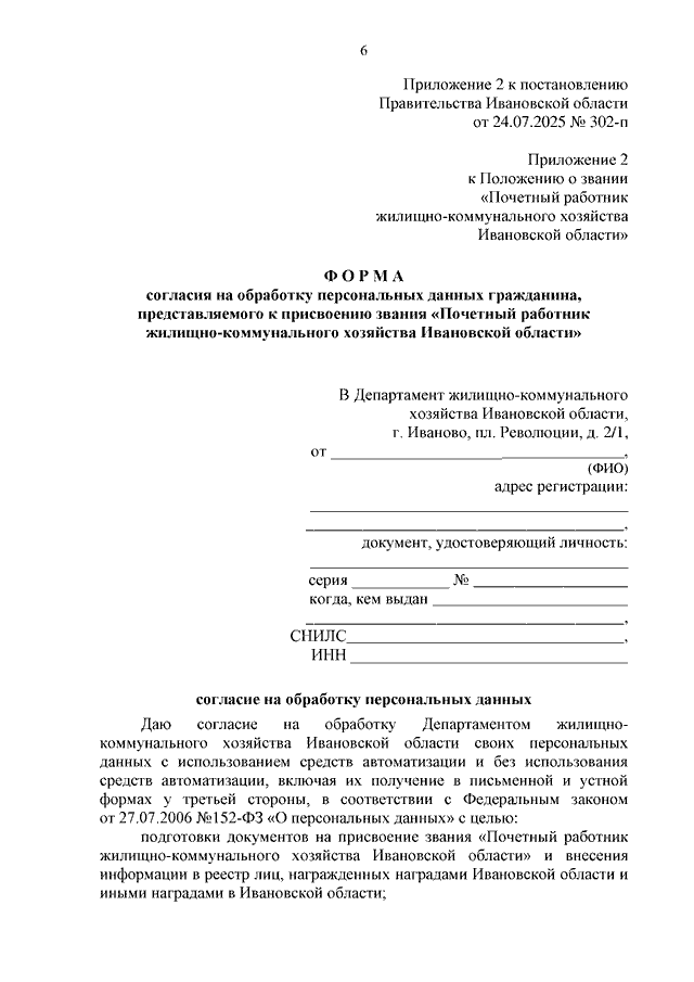 Постановление Правительства Ивановской области от 24.07.2025 N 302-п "О внесении изменений в постановление Правительства Ивановской области от 30.11.2010 N 430-п "Об учреждении звания "Почетный работник жилищно-коммунального хозяйства Ивановской области"