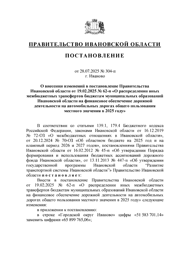 Постановление Правительства Ивановской области от 28.07.2025 N 304-п "О внесении изменений в постановление Правительства Ивановской области от 19.02.2025 N 62-п "О распределении иных межбюджетных трансфертов бюджетам муниципальных образований Ивановской области на финансовое обеспечение дорожной деятельности на автомобильных дорогах общего пользования местного значения в 2025 году"
