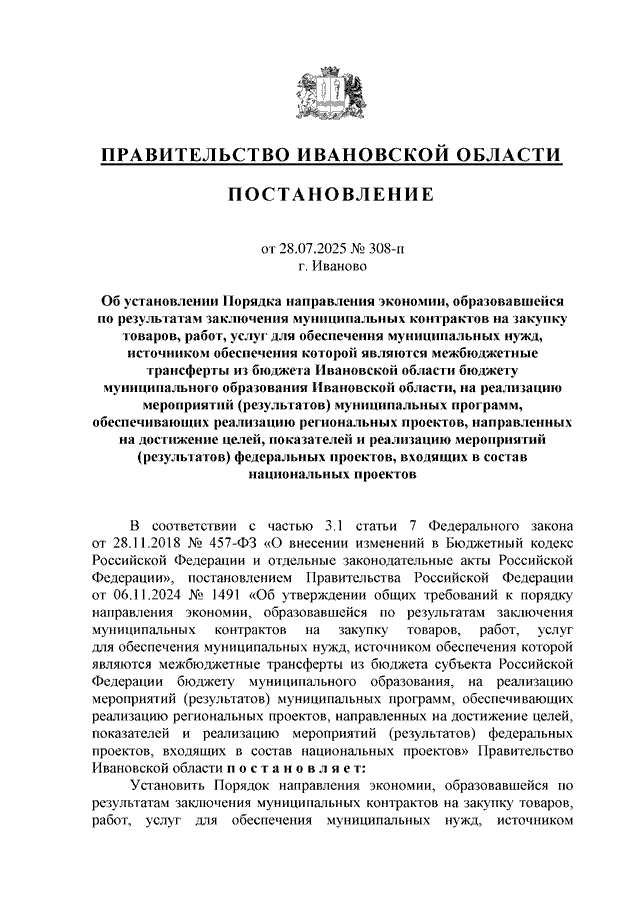 Постановление Правительства Ивановской области от 28.07.2025 N 308-п "Об установлении Порядка направления экономии, образовавшейся по результатам заключения муниципальных контрактов на закупку товаров, работ, услуг для обеспечения муниципальных нужд, источником обеспечения которой являются межбюджетные трансферты из бюджета Ивановской области бюджету муниципального образования Ивановской области, на реализацию мероприятий (результатов) муниципальных программ, обеспечивающих реализацию региональных проектов, направленных на достижение целей, показателей и реализацию мероприятий (результатов) федеральных проектов, входящих в состав национальных проектов"