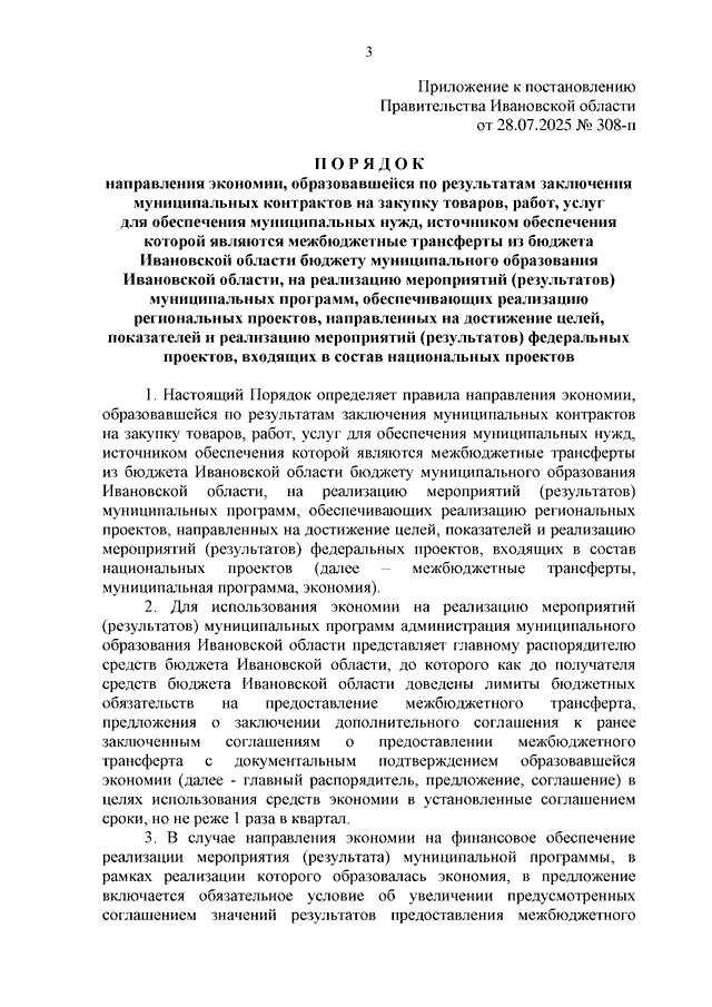 Постановление Правительства Ивановской области от 28.07.2025 N 308-п "Об установлении Порядка направления экономии, образовавшейся по результатам заключения муниципальных контрактов на закупку товаров, работ, услуг для обеспечения муниципальных нужд, источником обеспечения которой являются межбюджетные трансферты из бюджета Ивановской области бюджету муниципального образования Ивановской области, на реализацию мероприятий (результатов) муниципальных программ, обеспечивающих реализацию региональных проектов, направленных на достижение целей, показателей и реализацию мероприятий (результатов) федеральных проектов, входящих в состав национальных проектов"