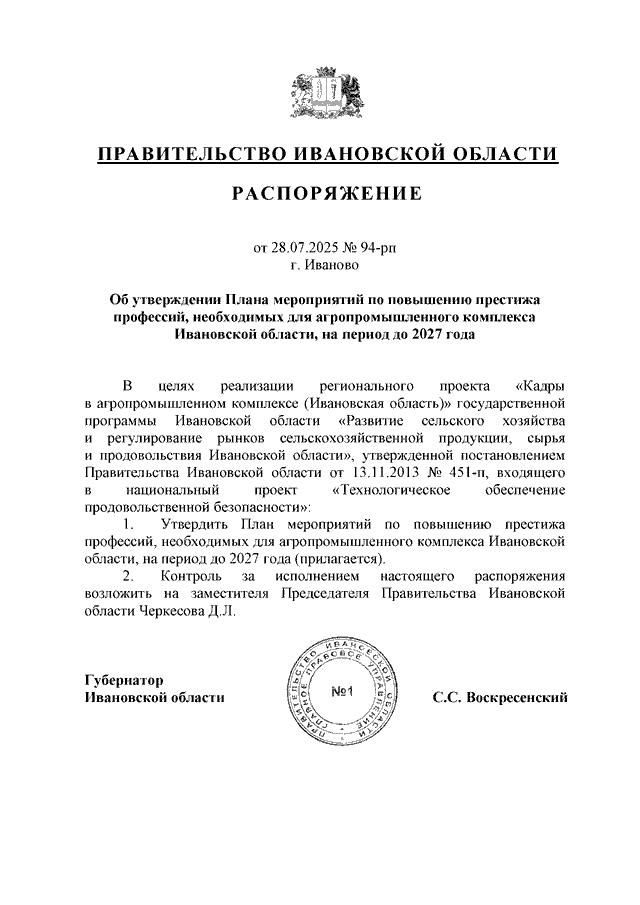 Распоряжение Правительства Ивановской области от 28.07.2025 N 94-рп "Об утверждении Плана мероприятий по повышению престижа профессий, необходимых для агропромышленного комплекса Ивановской области, на период до 2027 года"