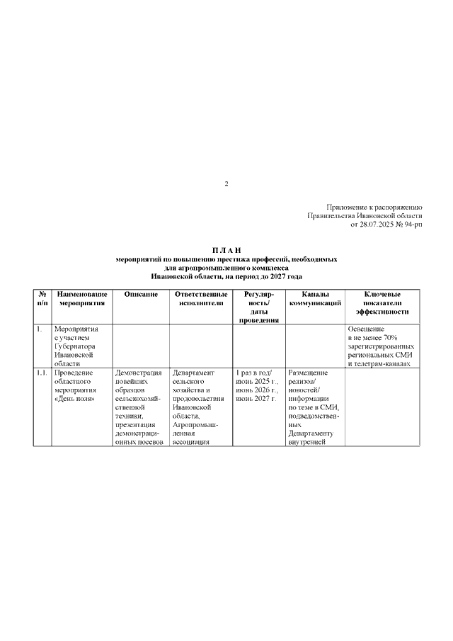 Распоряжение Правительства Ивановской области от 28.07.2025 N 94-рп "Об утверждении Плана мероприятий по повышению престижа профессий, необходимых для агропромышленного комплекса Ивановской области, на период до 2027 года"
