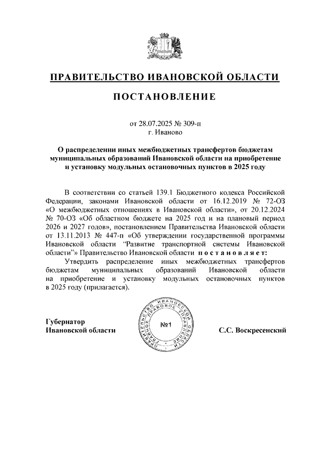 Постановление Правительства Ивановской области от 28.07.2025 N 309-п "О распределении иных межбюджетных трансфертов бюджетам муниципальных образований Ивановской области на приобретение и установку модульных остановочных пунктов в 2025 году"