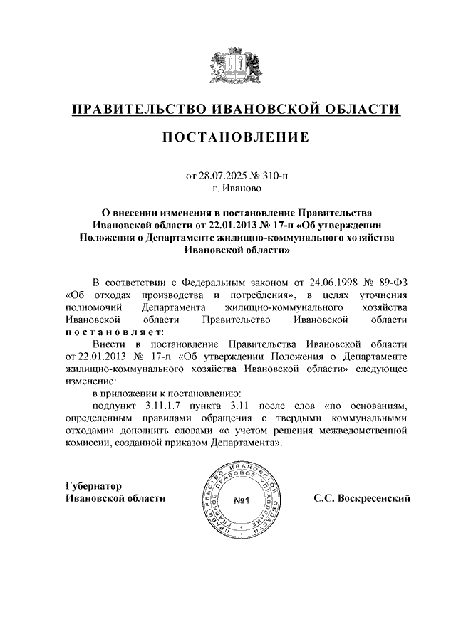 Постановление Правительства Ивановской области от 28.07.2025 N 310-п "О внесении изменения в постановление Правительства Ивановской области от 22.01.2013 N 17-п "Об утверждении Положения о Департаменте жилищно-коммунального хозяйства Ивановской области"
