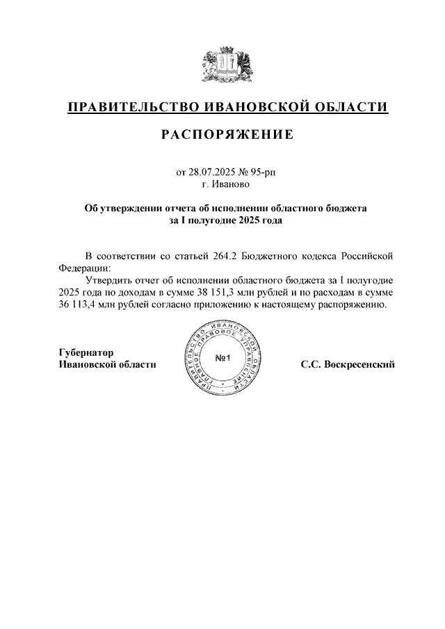 Распоряжение Правительства Ивановской области от 28.07.2025 N 95-рп "Об утверждении отчета об исполнении областного бюджета за I полугодие 2025 года"
