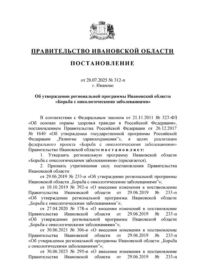 Постановление Правительства Ивановской области от 28.07.2025 N 312-п "Об утверждении региональной программы Ивановской области "Борьба с онкологическими заболеваниями"