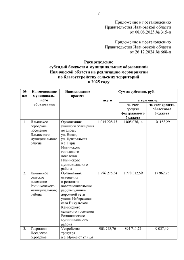 Постановление Правительства Ивановской области от 08.08.2025 N 315-п "О внесении изменения в постановление Правительства Ивановской области от 26.12.2024 N 668-п "О распределении субсидий бюджетам муниципальных образований Ивановской области на реализацию мероприятий по благоустройству сельских территорий в 2025 году"