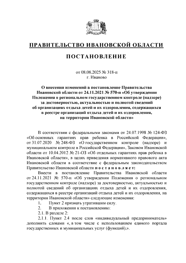 Постановление Правительства Ивановской области от 08.08.2025 N 318-п "О внесении изменений в постановление Правительства Ивановской области от 24.11.2021 N 570-п "Об утверждении Положения о региональном государственном контроле (надзоре) за достоверностью, актуальностью и полнотой сведений об организациях отдыха детей и их оздоровления, содержащихся в реестре организаций отдыха детей и их оздоровления, на территории Ивановской области"