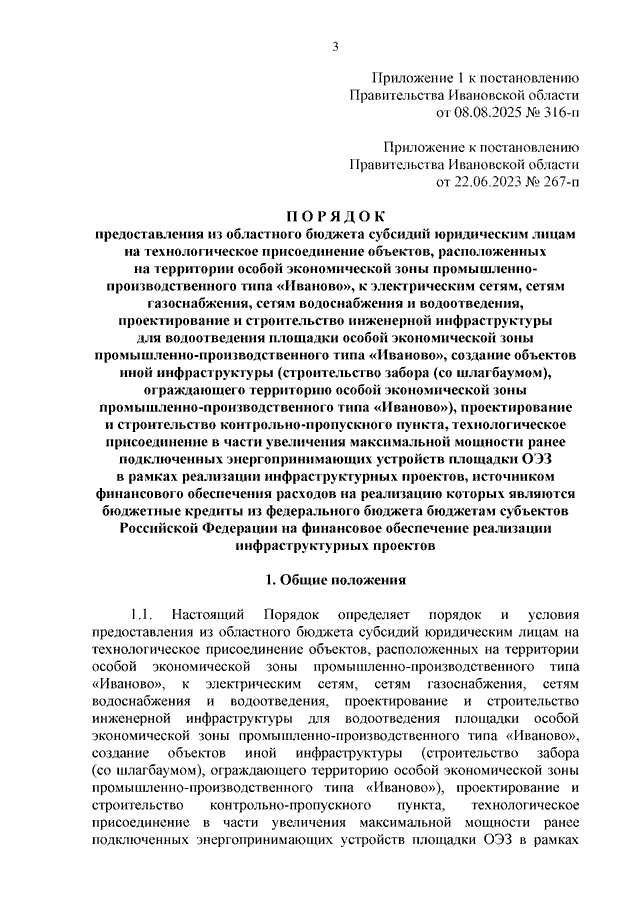 Постановление Правительства Ивановской области от 08.08.2025 N 316-п "О внесении изменений в некоторые постановления Правительства Ивановской области" (вместе с "Порядком предоставления из областного бюджета субсидий юридическим лицам на технологическое присоединение объектов, расположенных на территории особой экономической зоны промышленно-производственного типа "Иваново", к электрическим сетям, сетям газоснабжения, сетям водоснабжения и водоотведения, проектирование и строительство инженерной инфраструктуры для водоотведения площадки особой экономической зоны промышленно-производственного типа "Иваново", создание объектов иной инфраструктуры (строительство забора (со шлагбаумом), ограждающего территорию особой экономической зоны промышленно-производственного типа "Иваново"), проектирование и строительство контрольно-пропускного пункта, технологическое присоединение в части увеличения максимальной мощности ранее подключенных энергопринимающих устройств площадки ОЭЗ в рамках реализации инфраструктурных проектов, источником финансового обеспечения расходов на реализацию которых являются бюджетные кредиты из федерального бюджета бюджетам субъектов Российской Федерации на финансовое обеспечение реализации инфраструктурных проектов", "Порядком предоставления из областного бюджета субсидий некоммерческим организациям, не являющимся государственными (муниципальными) учреждениями, на технологическое присоединение создаваемого кампуса на территории города Иваново, ограниченной улицей Зверева, переулком Слесарным, улицами Громобоя, Жиделева, Демидова, проспектом Ленина, площадью Пушкина, улицей Жарова, к сетям водоснабжения, водоотведения, теплоснабжения, электроснабжения в рамках реализации инфраструктурных проектов, источником финансового обеспечения расходов на реализацию которых являются бюджетные кредиты из федерального бюджета бюджетам субъектов Российской Федерации на финансовое обеспечение реализации инфраструктурных проектов")