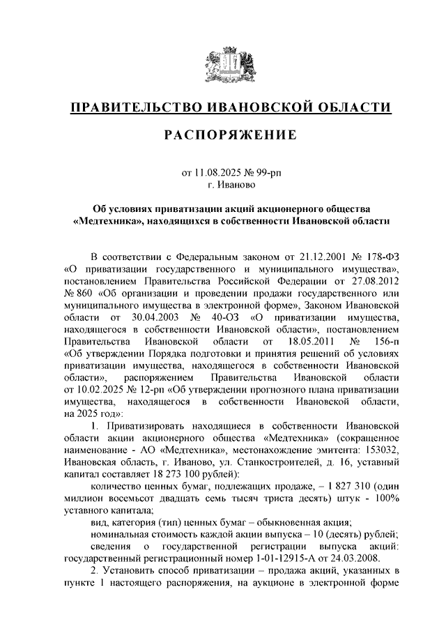 Распоряжение Правительства Ивановской области от 11.08.2025 N 99-рп "Об условиях приватизации акций акционерного общества "Медтехника", находящихся в собственности Ивановской области"