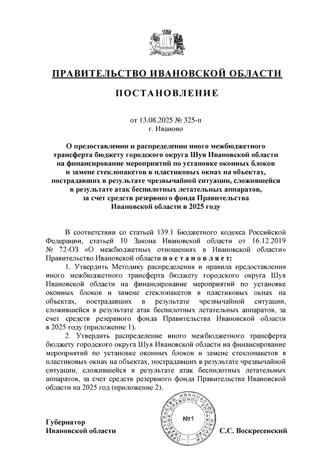 Постановление Правительства Ивановской области от 13.08.2025 N 325-п "О предоставлении и распределении иного межбюджетного трансферта бюджету городского округа Шуя Ивановской области на финансирование мероприятий по установке оконных блоков и замене стеклопакетов в пластиковых окнах на объектах, пострадавших в результате чрезвычайной ситуации, сложившейся в результате атак беспилотных летательных аппаратов, за счет средств резервного фонда Правительства Ивановской области в 2025 году" (вместе с "Методикой распределения и правилами предоставления иного межбюджетного трансферта бюджету городского округа Шуя Ивановской области на финансирование мероприятий по установке оконных блоков и замене стеклопакетов в пластиковых окнах на объектах, пострадавших в результате чрезвычайной ситуации, сложившейся в результате атак беспилотных летательных аппаратов, за счет средств резервного фонда Правительства Ивановской области в 2025 году")