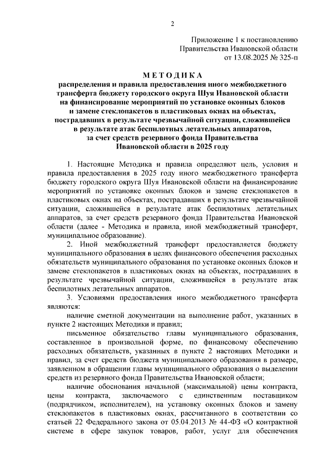 Постановление Правительства Ивановской области от 13.08.2025 N 325-п "О предоставлении и распределении иного межбюджетного трансферта бюджету городского округа Шуя Ивановской области на финансирование мероприятий по установке оконных блоков и замене стеклопакетов в пластиковых окнах на объектах, пострадавших в результате чрезвычайной ситуации, сложившейся в результате атак беспилотных летательных аппаратов, за счет средств резервного фонда Правительства Ивановской области в 2025 году" (вместе с "Методикой распределения и правилами предоставления иного межбюджетного трансферта бюджету городского округа Шуя Ивановской области на финансирование мероприятий по установке оконных блоков и замене стеклопакетов в пластиковых окнах на объектах, пострадавших в результате чрезвычайной ситуации, сложившейся в результате атак беспилотных летательных аппаратов, за счет средств резервного фонда Правительства Ивановской области в 2025 году")