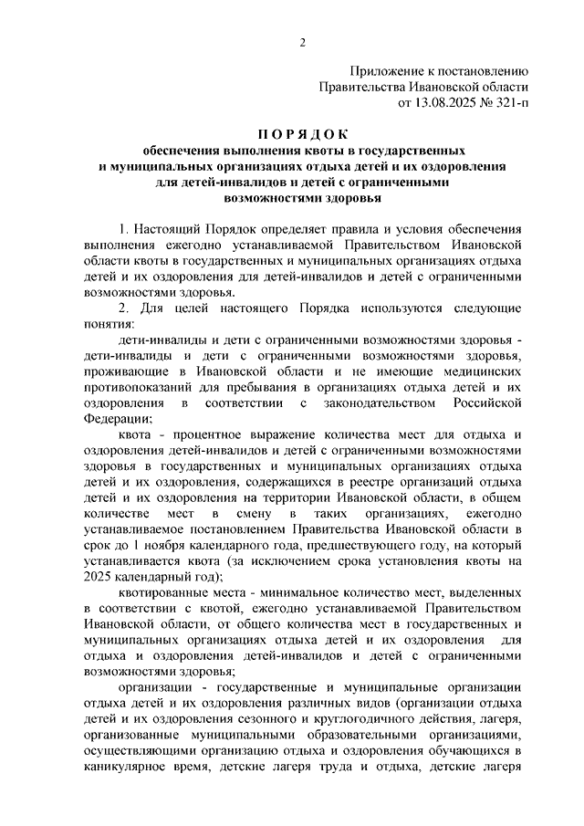 Постановление Правительства Ивановской области от 13.08.2025 N 321-п "Об утверждении Порядка обеспечения выполнения квоты в государственных и муниципальных организациях отдыха детей и их оздоровления для детей-инвалидов и детей с ограниченными возможностями здоровья"