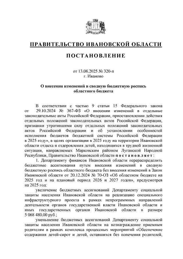 Постановление Правительства Ивановской области от 13.08.2025 N 320-п "О внесении изменений в сводную бюджетную роспись областного бюджета"