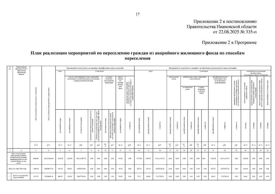 Постановление Правительства Ивановской области от 22.08.2025 N 335-п "О внесении изменений в постановление Правительства Ивановской области от 03.06.2024 N 232-п "Об утверждении региональной адресной программы "Переселение граждан из аварийного жилищного фонда на территории Ивановской области на 2024 - 2030 годы" (вместе с "Реестром жилищного фонда (многоквартирные дома, дома блокированной застройки, объекты индивидуального жилищного строительства)", "Планом реализации мероприятий по переселению граждан из аварийного жилищного фонда по способам переселения", "Планом мероприятий по переселению граждан из аварийного жилищного фонда")