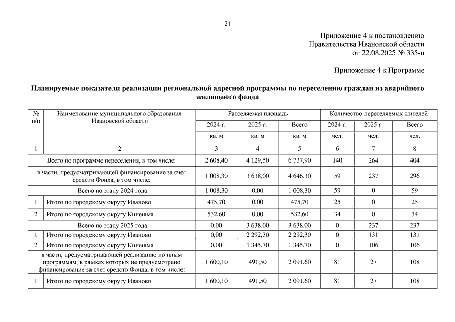 Постановление Правительства Ивановской области от 22.08.2025 N 335-п "О внесении изменений в постановление Правительства Ивановской области от 03.06.2024 N 232-п "Об утверждении региональной адресной программы "Переселение граждан из аварийного жилищного фонда на территории Ивановской области на 2024 - 2030 годы" (вместе с "Реестром жилищного фонда (многоквартирные дома, дома блокированной застройки, объекты индивидуального жилищного строительства)", "Планом реализации мероприятий по переселению граждан из аварийного жилищного фонда по способам переселения", "Планом мероприятий по переселению граждан из аварийного жилищного фонда")