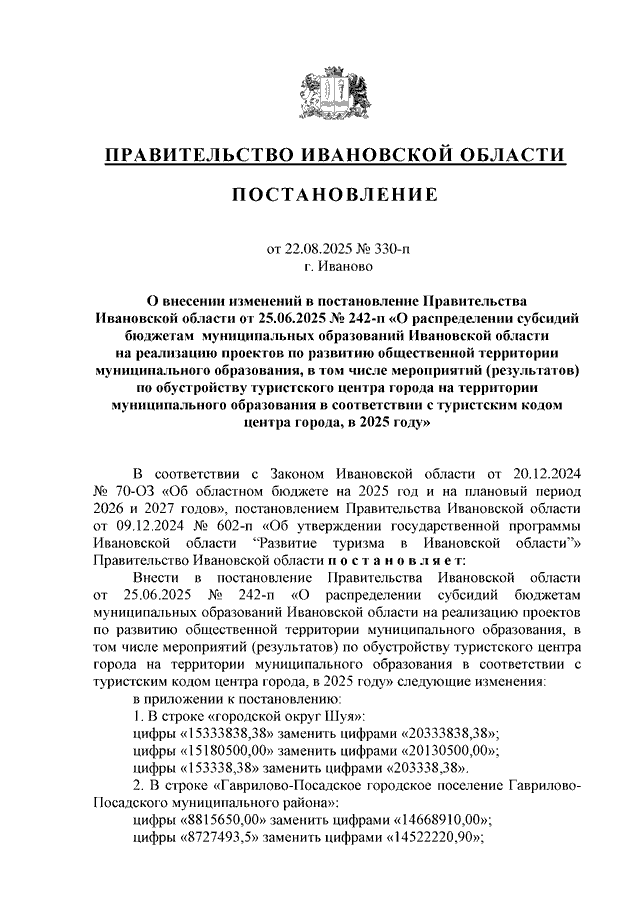 Постановление Правительства Ивановской области от 22.08.2025 N 330-п "О внесении изменений в постановление Правительства Ивановской области от 25.06.2025 N 242-п "О распределении субсидий бюджетам муниципальных образований Ивановской области на реализацию проектов по развитию общественной территории муниципального образования, в том числе мероприятий (результатов) по обустройству туристского центра города на территории муниципального образования в соответствии с туристским кодом центра города, в 2025 году"