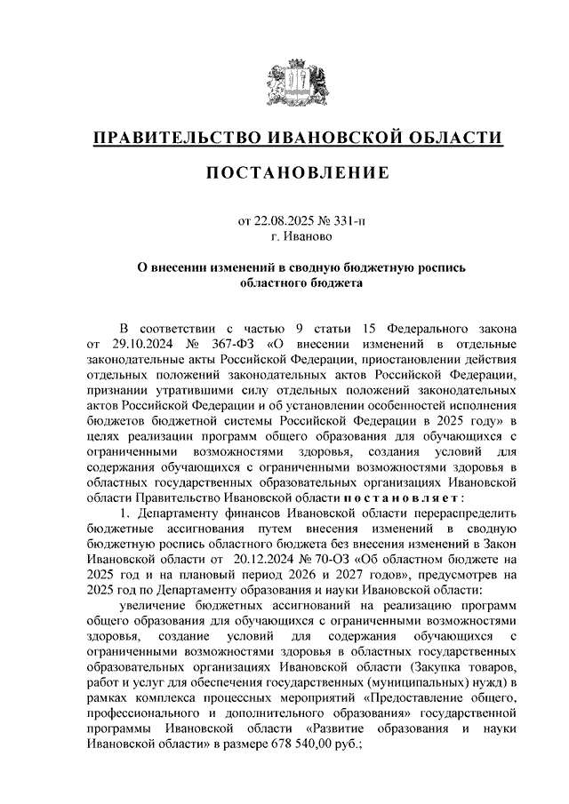 Постановление Правительства Ивановской области от 22.08.2025 N 331-п "О внесении изменений в сводную бюджетную роспись областного бюджета"
