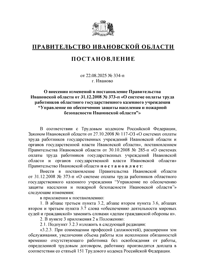 Постановление Правительства Ивановской области от 22.08.2025 N 334-п "О внесении изменений в постановление Правительства Ивановской области от 31.12.2008 N 373-п "О системе оплаты труда работников областного государственного казенного учреждения "Управление по обеспечению защиты населения и пожарной безопасности Ивановской области"