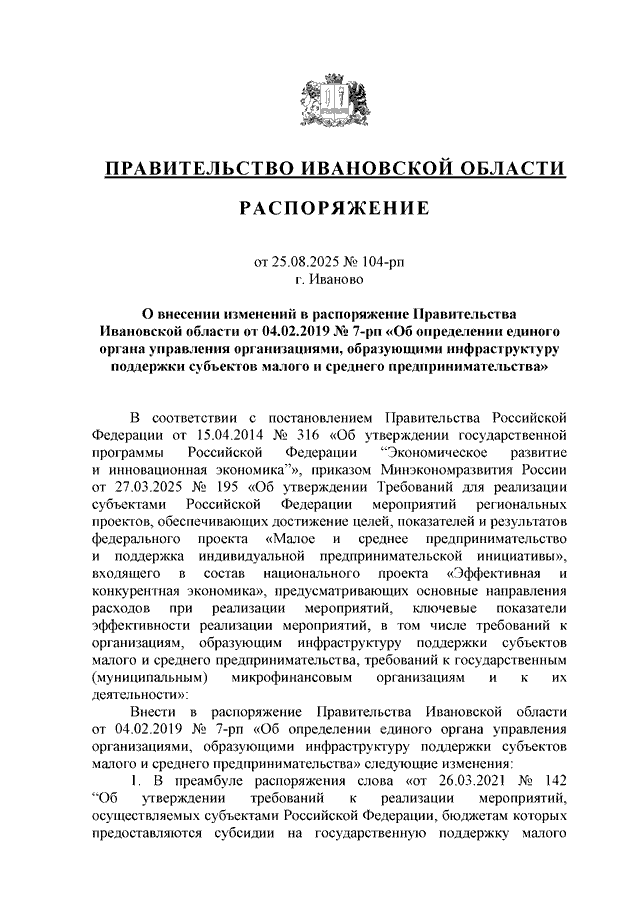 Распоряжение Правительства Ивановской области от 25.08.2025 N 104-рп "О внесении изменений в распоряжение Правительства Ивановской области от 04.02.2019 N 7-рп "Об определении единого органа управления организациями, образующими инфраструктуру поддержки субъектов малого и среднего предпринимательства"