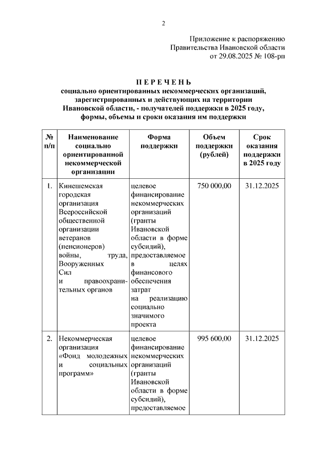 Распоряжение Правительства Ивановской области от 29.08.2025 N 108-рп "О формах, объемах и сроках оказания поддержки социально ориентированным некоммерческим организациям, зарегистрированным и действующим на территории Ивановской области, в 2025 году" (вместе с "Перечнем социально ориентированных некоммерческих организаций, зарегистрированных и действующих на территории Ивановской области, - получателей поддержки в 2025 году, формами, объемами и сроками оказания им поддержки")