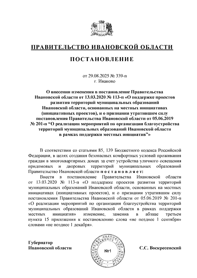 Постановление Правительства Ивановской области от 29.08.2025 N 339-п "О внесении изменения в постановление Правительства Ивановской области от 13.03.2020 N 113-п "О поддержке проектов развития территорий муниципальных образований Ивановской области, основанных на местных инициативах (инициативных проектов), и о признании утратившим силу постановления Правительства Ивановской области от 05.06.2019 N 201-п "О реализации мероприятий по организации благоустройства территорий муниципальных образований Ивановской области в рамках поддержки местных инициатив"