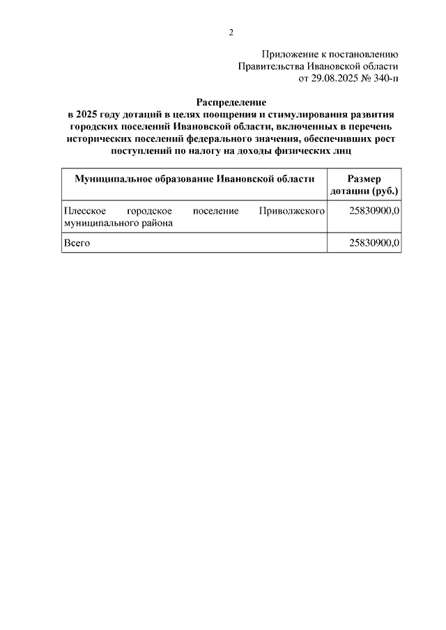 Постановление Правительства Ивановской области от 29.08.2025 N 340-п "О распределении в 2025 году дотаций в целях поощрения и стимулирования развития городских поселений Ивановской области, включенных в перечень исторических поселений федерального значения, обеспечивших рост поступлений по налогу на доходы физических лиц"