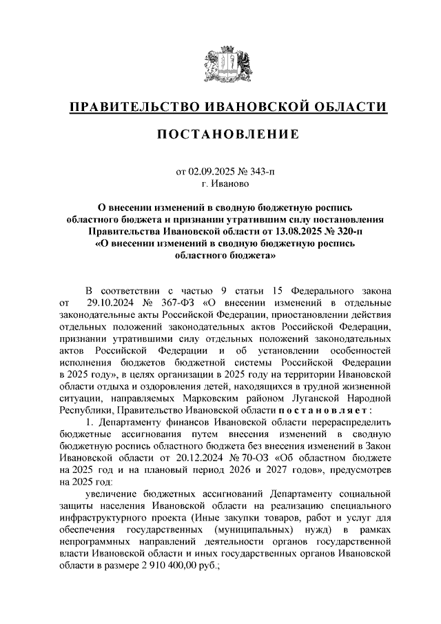 Постановление Правительства Ивановской области от 02.09.2025 N 343-п "О внесении изменений в сводную бюджетную роспись областного бюджета и признании утратившим силу постановления Правительства Ивановской области от 13.08.2025 N 320-п "О внесении изменений в сводную бюджетную роспись областного бюджета"