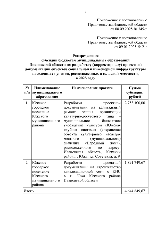 Постановление Правительства Ивановской области от 08.09.2025 N 345-п "О внесении изменения в постановление Правительства Ивановской области от 09.01.2025 N 2-п "О распределении субсидии бюджетам муниципальных образований Ивановской области на разработку (корректировку) проектной документации объектов социальной и инженерной инфраструктуры населенных пунктов, расположенных в сельской местности, в 2025 году"