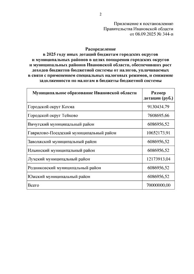 Постановление Правительства Ивановской области от 08.09.2025 N 344-п "О распределении в 2025 году иных дотаций бюджетам городских округов и муниципальных районов в целях поощрения городских округов и муниципальных районов Ивановской области, обеспечивших рост доходов бюджетов бюджетной системы от налогов, уплачиваемых в связи с применением специальных налоговых режимов, и снижение задолженности по налогам в бюджеты бюджетной системы"