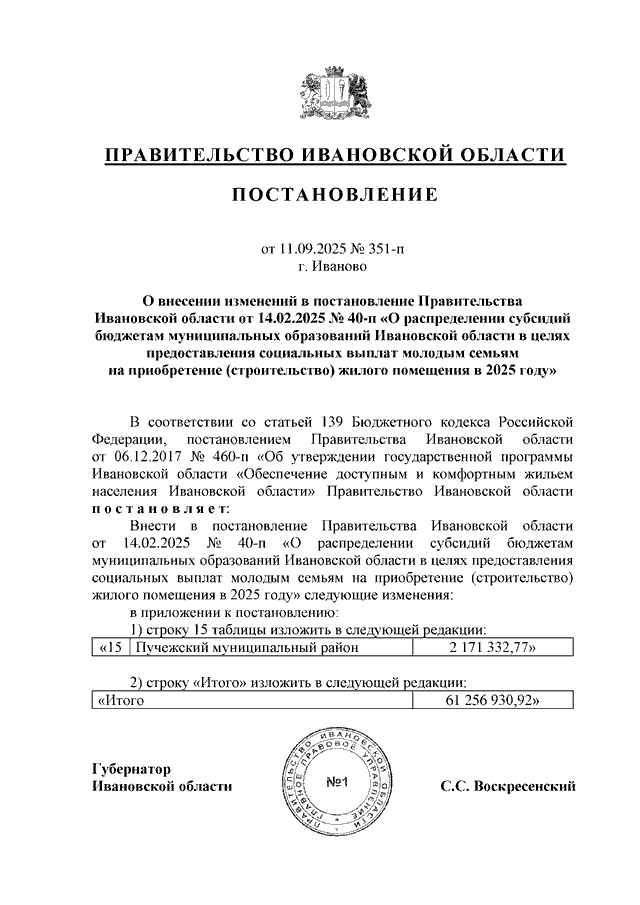 Постановление Правительства Ивановской области от 11.09.2025 N 351-п "О внесении изменений в постановление Правительства Ивановской области от 14.02.2025 N 40-п "О распределении субсидий бюджетам муниципальных образований Ивановской области в целях предоставления социальных выплат молодым семьям на приобретение (строительство) жилого помещения в 2025 году"