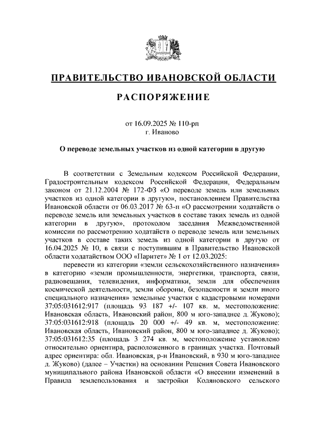Распоряжение Правительства Ивановской области от 16.09.2025 N 110-рп "О переводе земельных участков из одной категории в другую"