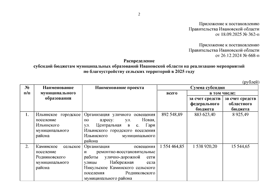 Постановление Правительства Ивановской области от 18.09.2025 N 362-п "О внесении изменения в постановление Правительства Ивановской области от 26.12.2024 N 668-п "О распределении субсидий бюджетам муниципальных образований Ивановской области на реализацию мероприятий по благоустройству сельских территорий в 2025 году"